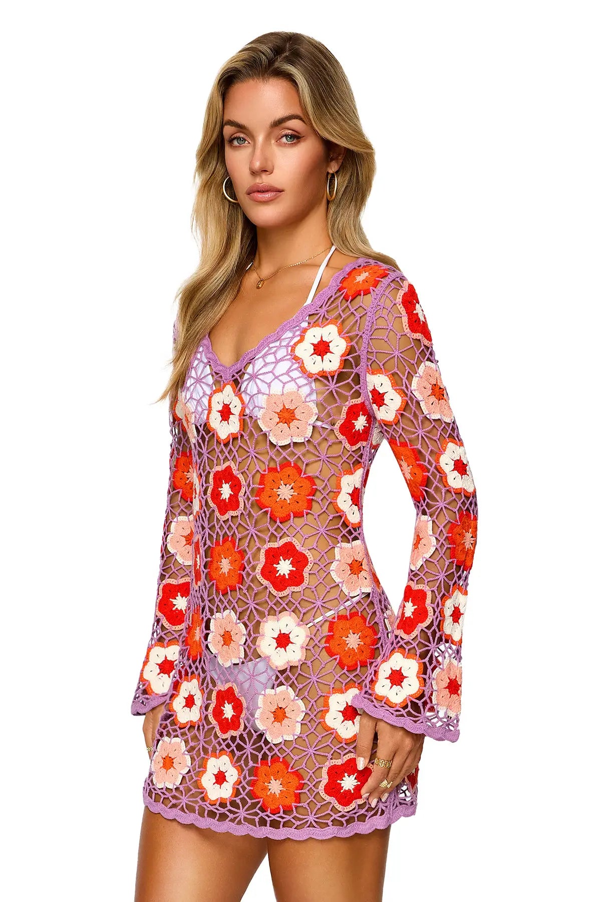 3D Camellia Embroidery Crochet Beach Cover Up Dress