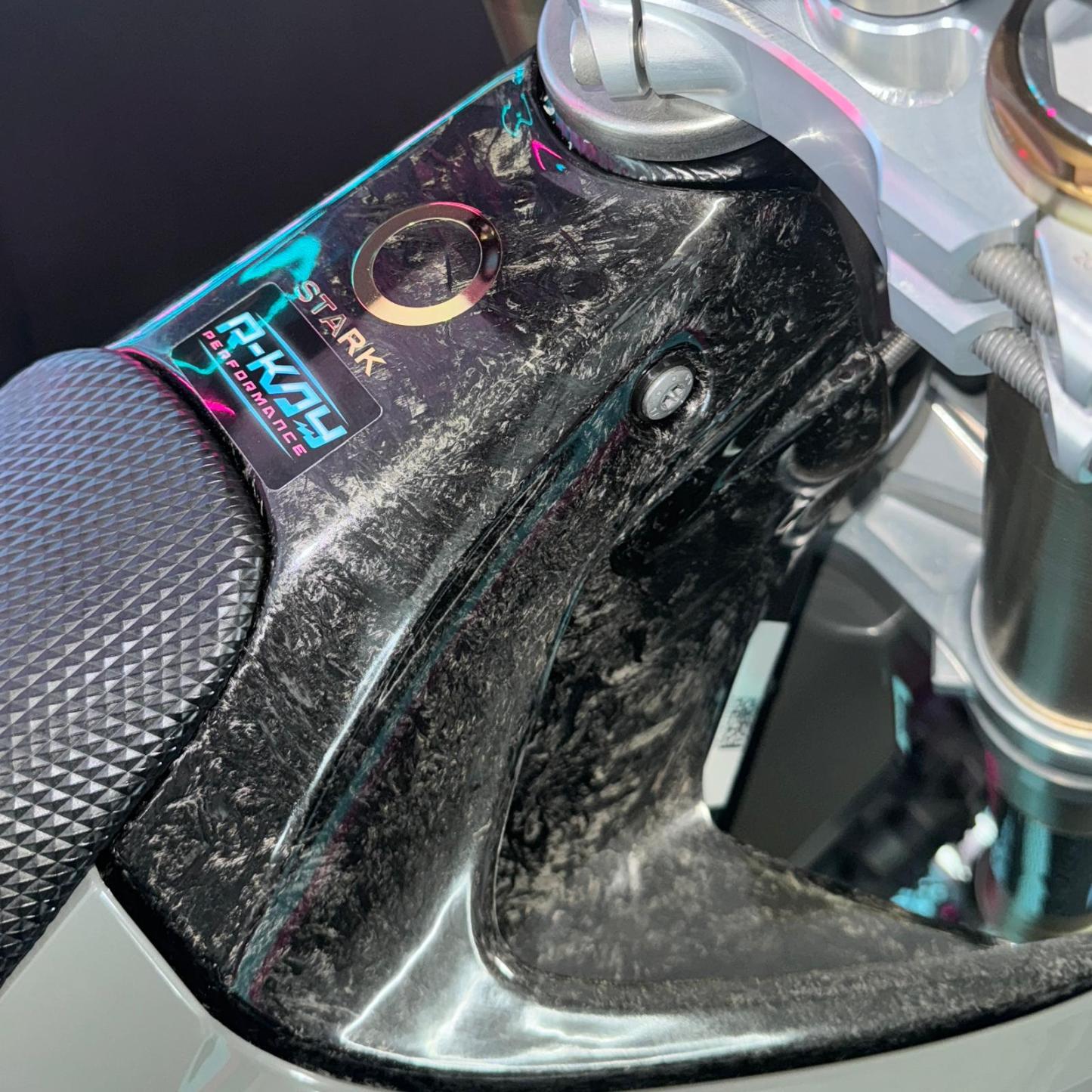 24 karat gold ‘Stark Future’ logo on the carbon fiber top section