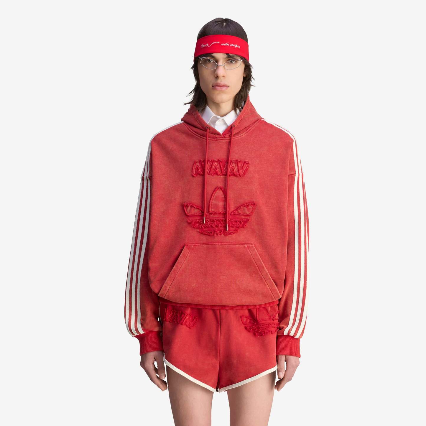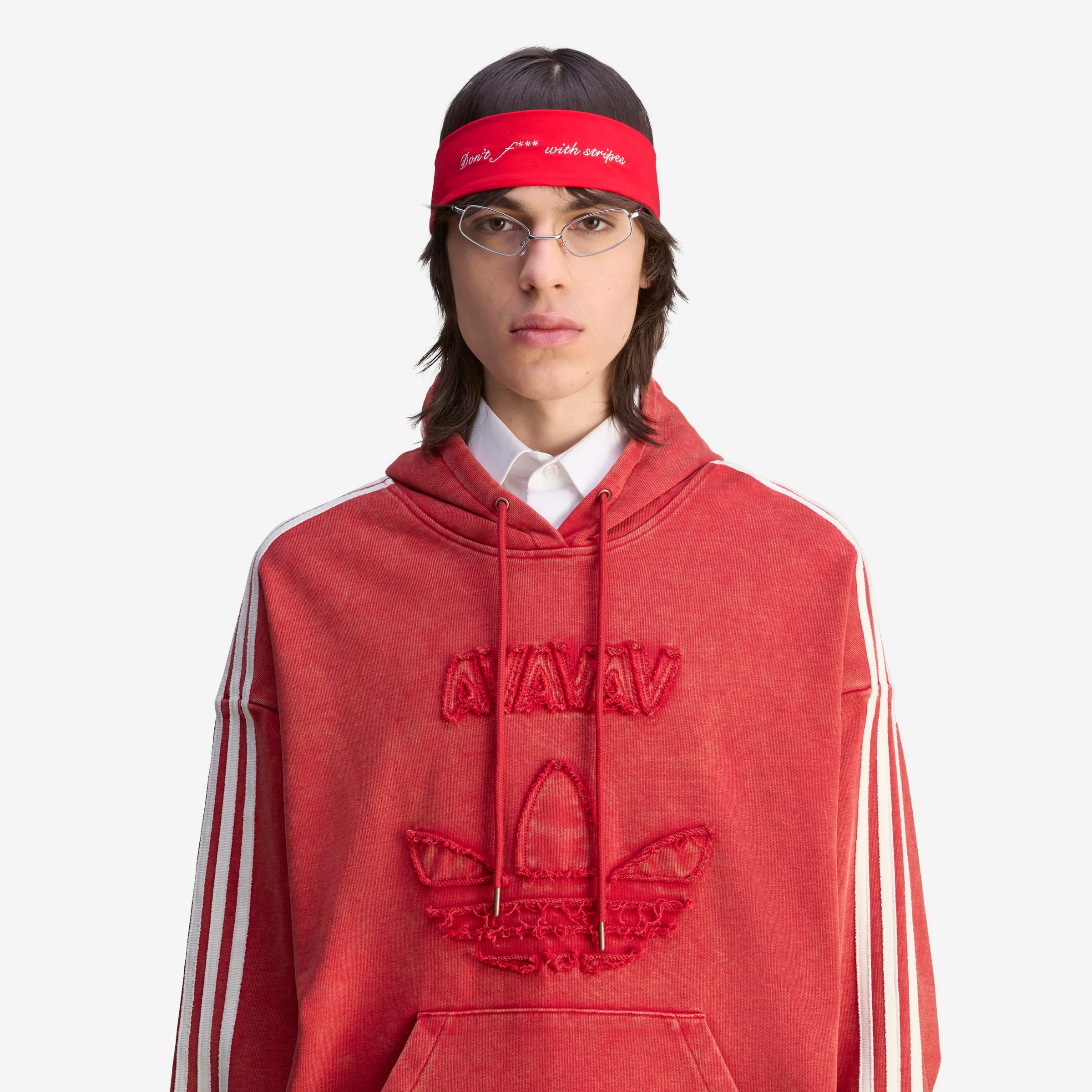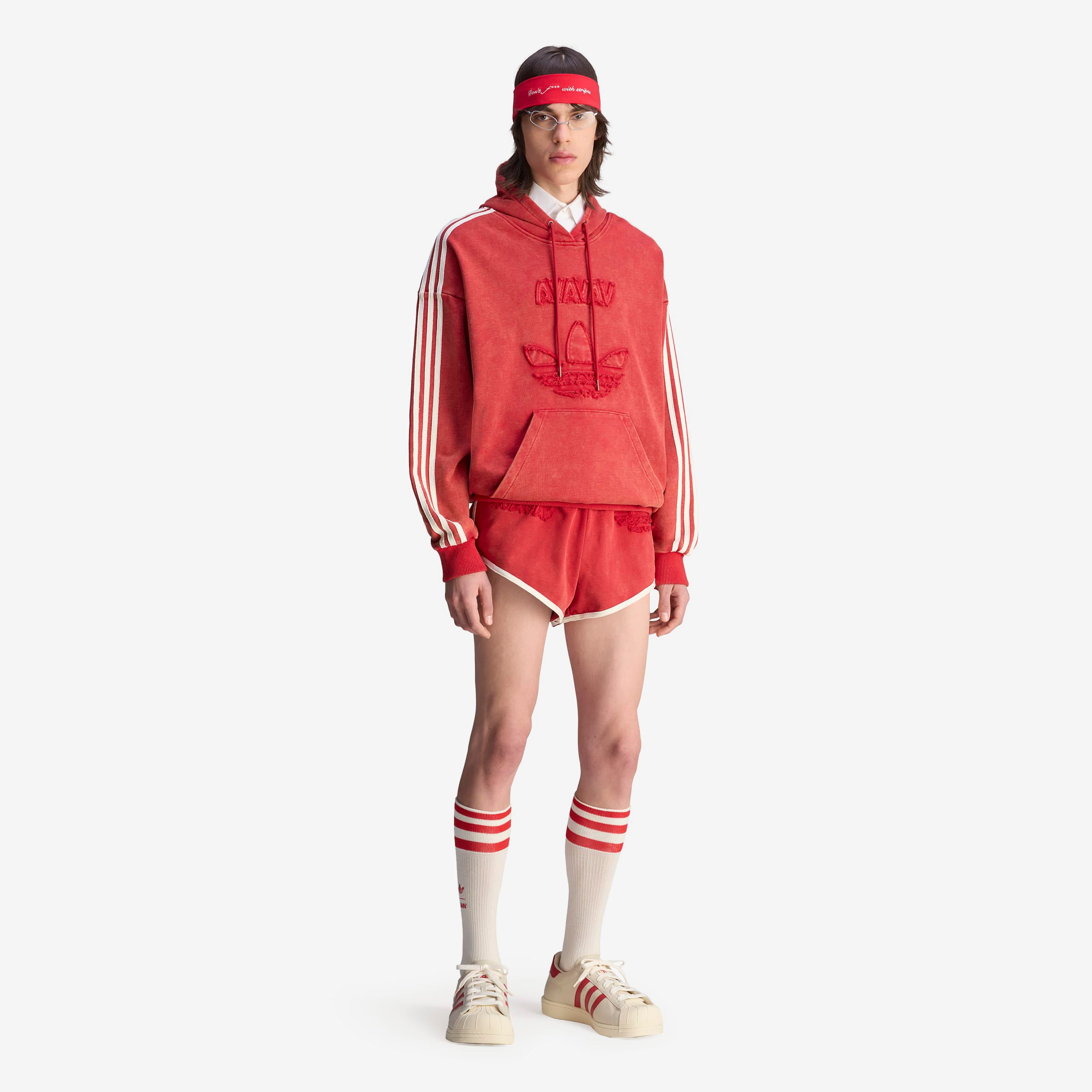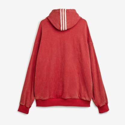 After teaming up for the first time in 2024, adidas Originals reunites with Swedish fashion label Avavav for Spring/Summer 2025 with a second subversive collaboration—redefining signature Avavav looks through a subverted sporting lens. Based on Avavav's iconic shoulderless silhouette, this adidas hoodie by Avavav borrows elements from the adidas archives to achieve a fresh look. It's crafted from distressed French terry material with a washed look, which gets emphasised further through the distressed branding execution, creating an air of casual luxury and vintage appeal.