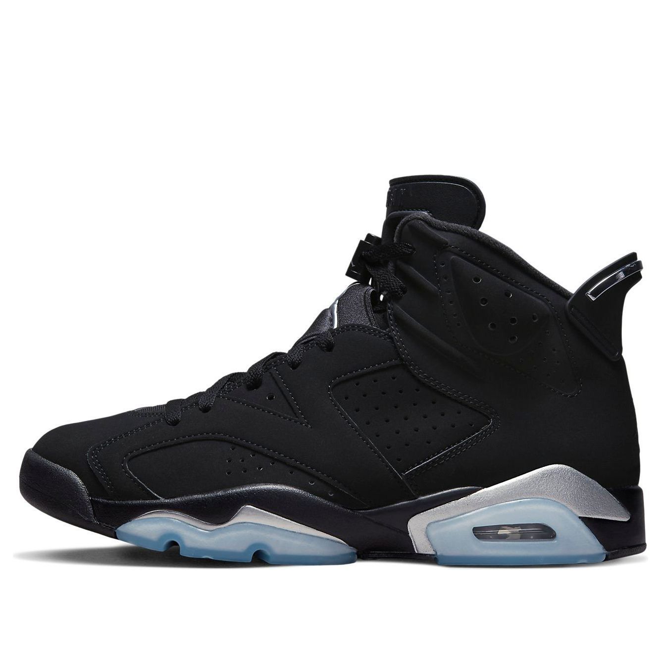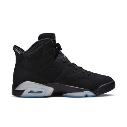 Introducing the Air Jordan 6 Retro Chrome Metallic Silver: an iconic shoe that offers style and a classic look for any occasion. This modern take on the AJ6 features a solid black nubuck upper, with silver Jumpman branding featured prominently on the lace guard. Standard AJ6 details add to its familiar style, like the windowed tongue and lace locks as well as a spoiler-like heel tag. The mid-top is securely mounted on a black polyurethane midsole, enhanced with metallic silver detailing and supported by a translucent rubber outsole. With its sleek silhouette and timeless style, the Air Jordan 6 Retro Chrome Metallic Silver delivers comfort and maximum cushioning - giving you an unparalleled fit suitable for any activity in your day. Take home this classic piece of sports fashion today!