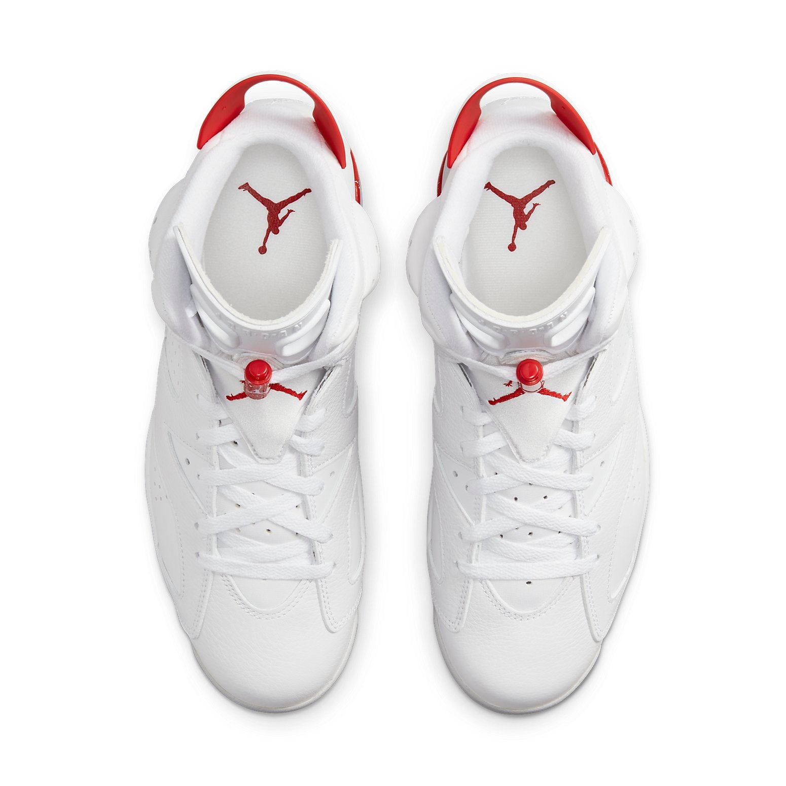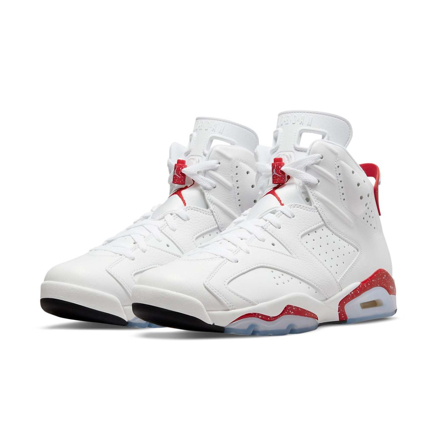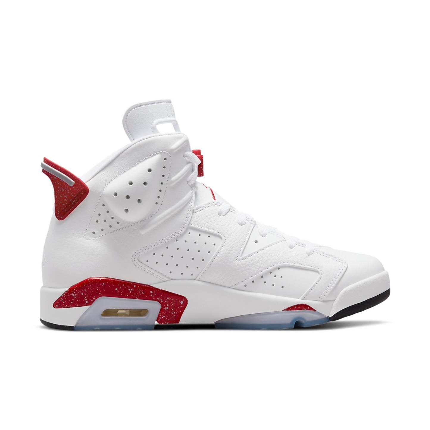 The Air Jordan 6 Retro 'Red Oreo' is a classic silhouette inspired by the shoes worn by basketball legend, Michael Jordan. Its sleek design is finished in white leather, with perforated detailing and a tonal Jumpman logo embroidered on the back heel. Crimson accents appear on the pull tag and midsole for contrast, while an exposed Air-sole unit in the heel and translucent rubber outsole provide cushioning for all-day comfort. The perfect choice for any avid Air Jordan collector or basketball player.
