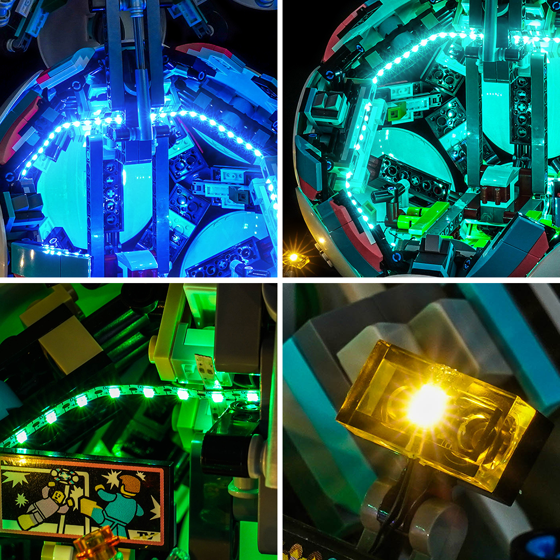 Inside the soccer ball, multiple color-changing LED strips and flash LEDs create a layered lighting effect that highlights the intricate mechanical core of the model. From cool blues and energetic greens to dramatic reds and vibrant purples, the lighting brings a whole new dimension to the build.