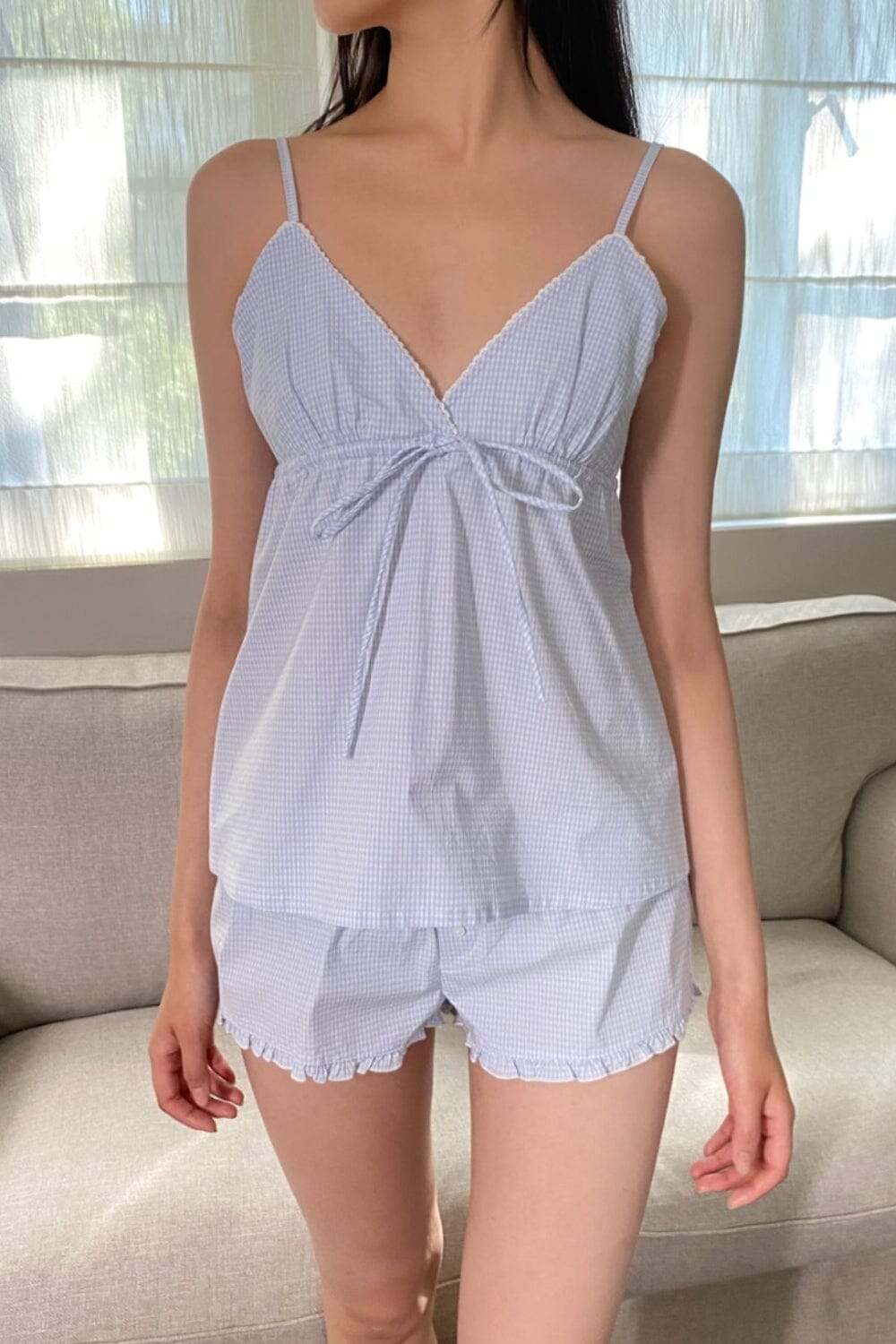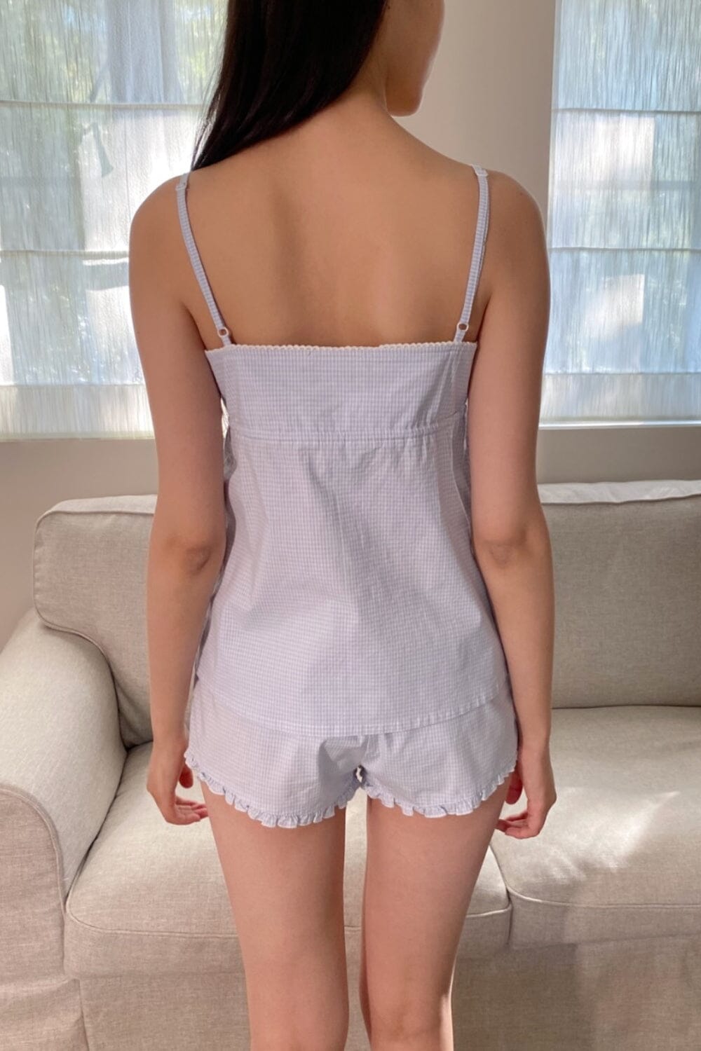 Plaid baby blue and white tank top with v-neck, tie in the back, adjustable straps with bows and white trim.Fabrics: 100% CottonMeasurements: length: 16" (40cm) , bust: 13" (33cm) Made in: China