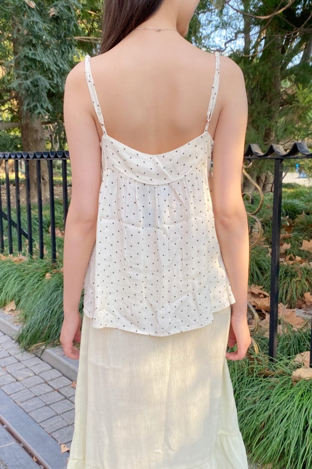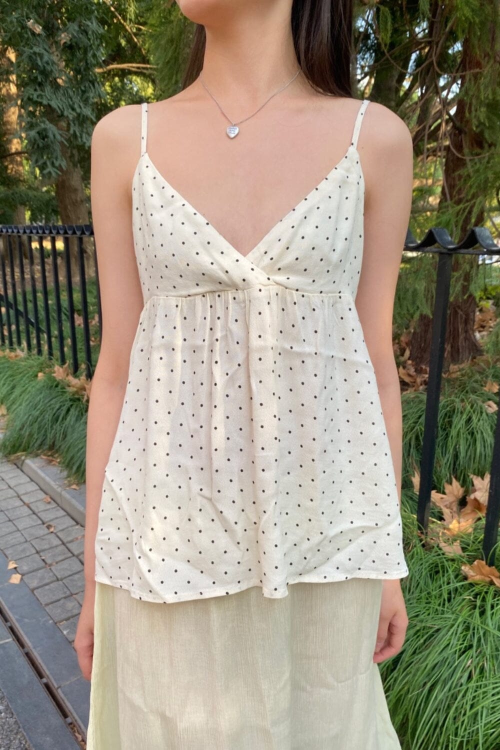 Flowy ivory tank top with v-neck, , adjustable straps and polka dot print.Fabrics: 100% ViscoseMeasurements: Length: 16" (40cm), bust: 13" (33cm)Made in: Italy