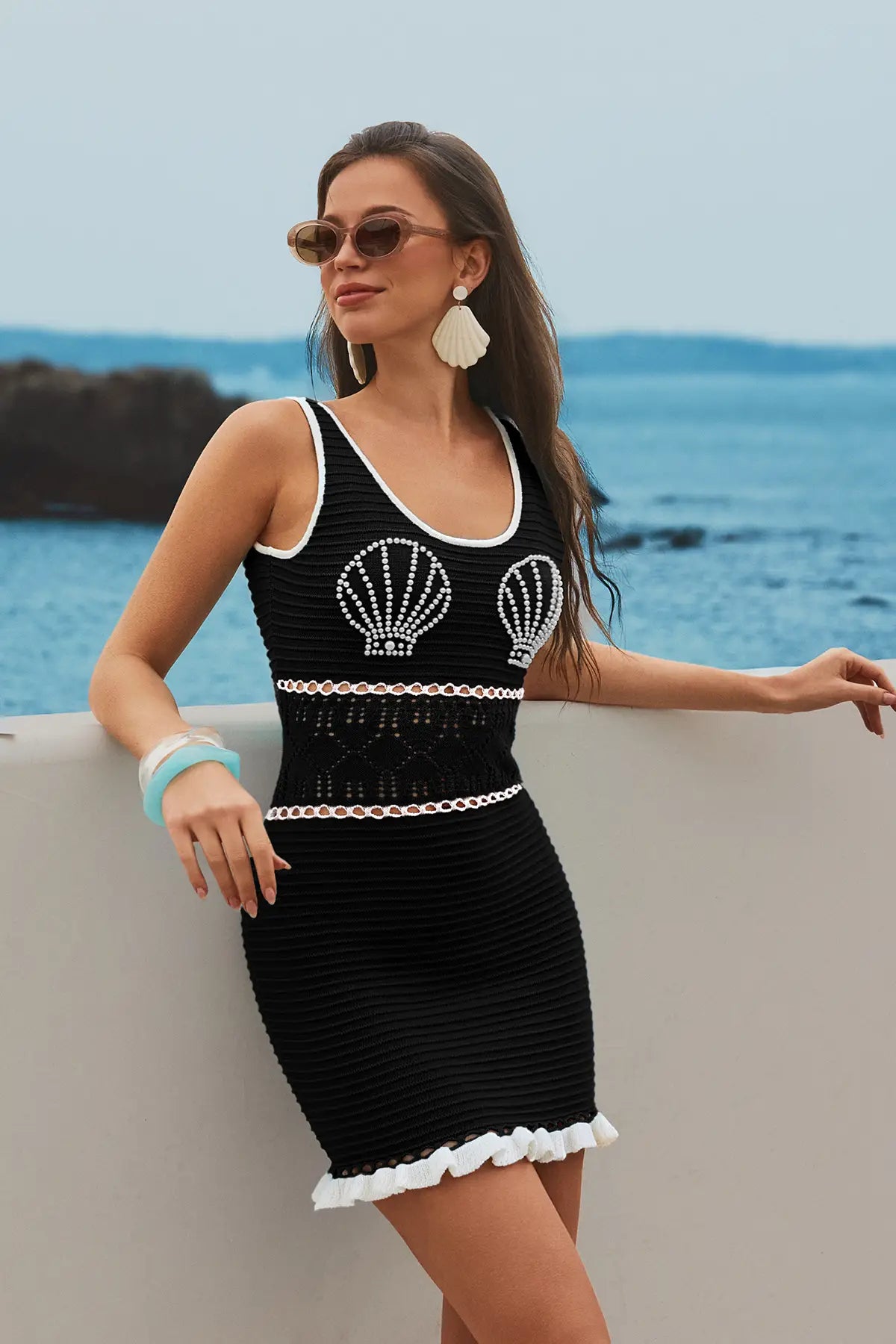 Elevate your beachside wardrobe with this exquisite crochet cover-up dress, featuring hand-sewn pearl embellishments and a stunning 3D shell design. Each pearl is meticulously stitched by hand, creating a one-of-a-kind piece that captures the essence of luxury resort wear.
