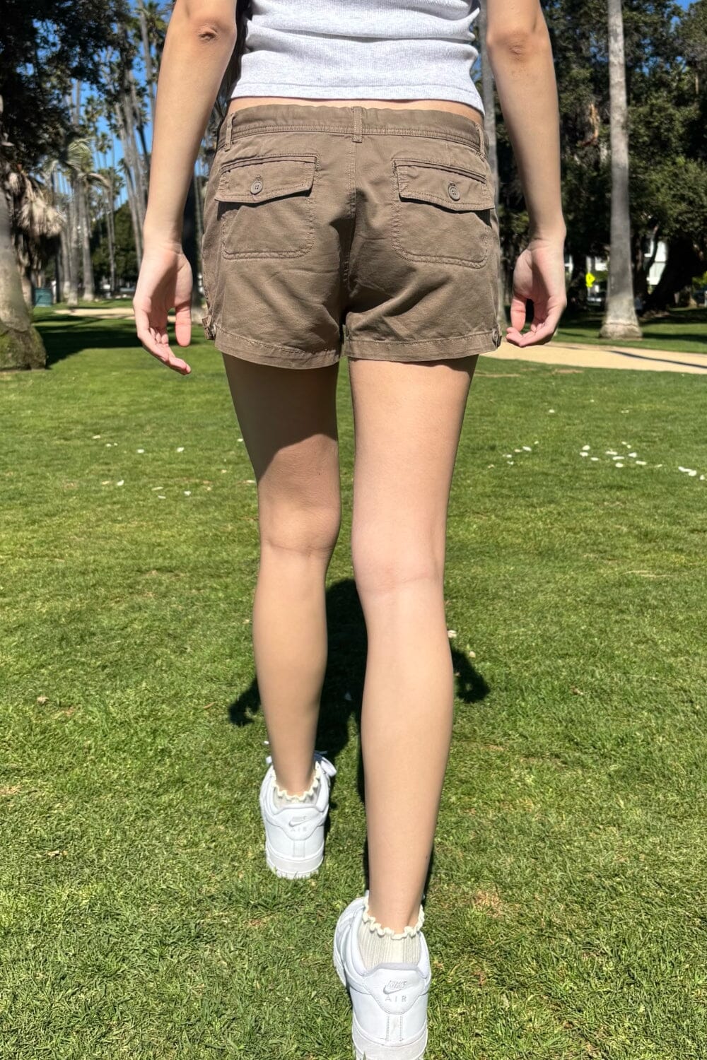 Low rise cargo shorts with a button and zip closure, two velcro side pockets and two velcro back pockets.Fabrics: 60% cotton, 40% polyesterMeasurement: Small: 10.5" (27 cm) rise, 9.5" (24 cm) inseam, 28" (71 cm) waist Made in: China