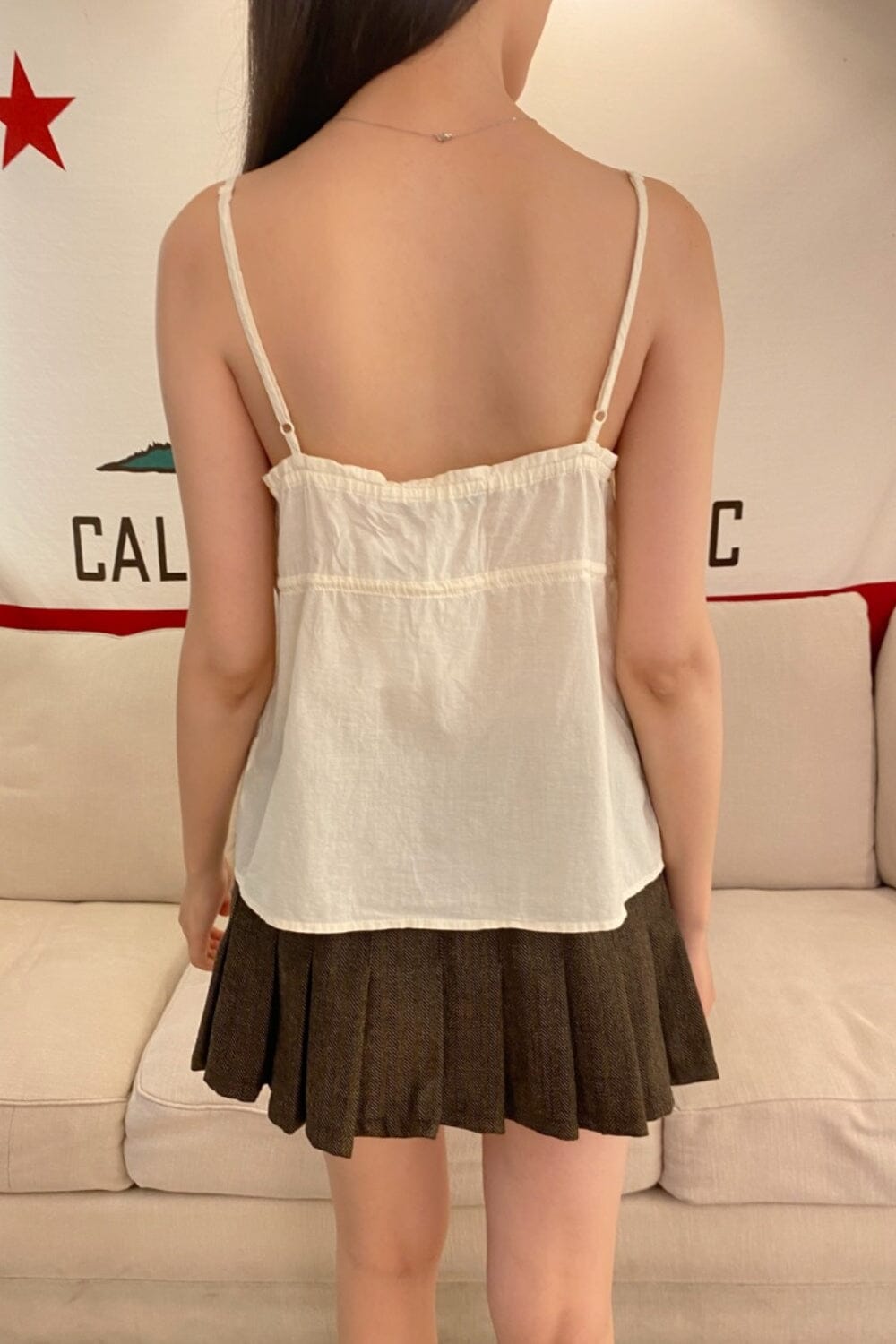 Tank top adjustable straps tie straps, lace detailing and trimmings, and an adjustable tie at the waist.Fabrics: 100% cottonMeasurements: 19" (48cm) length, 13" (33cm) bustMade in: China