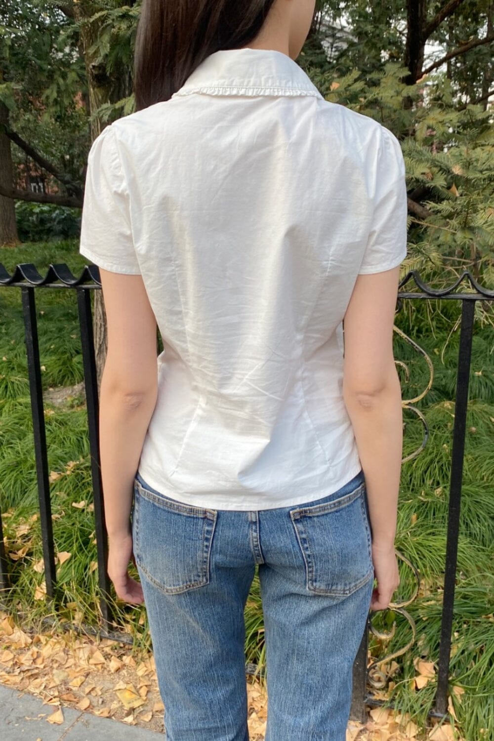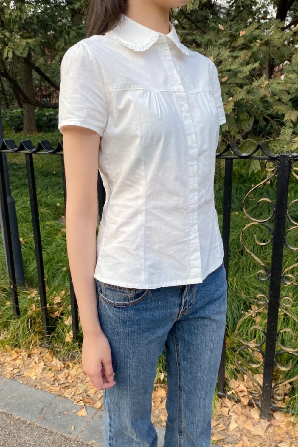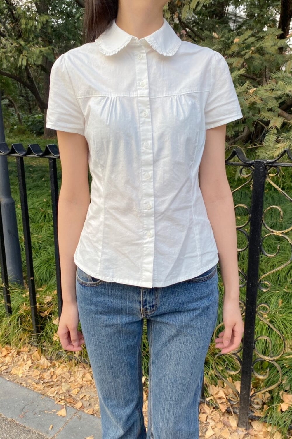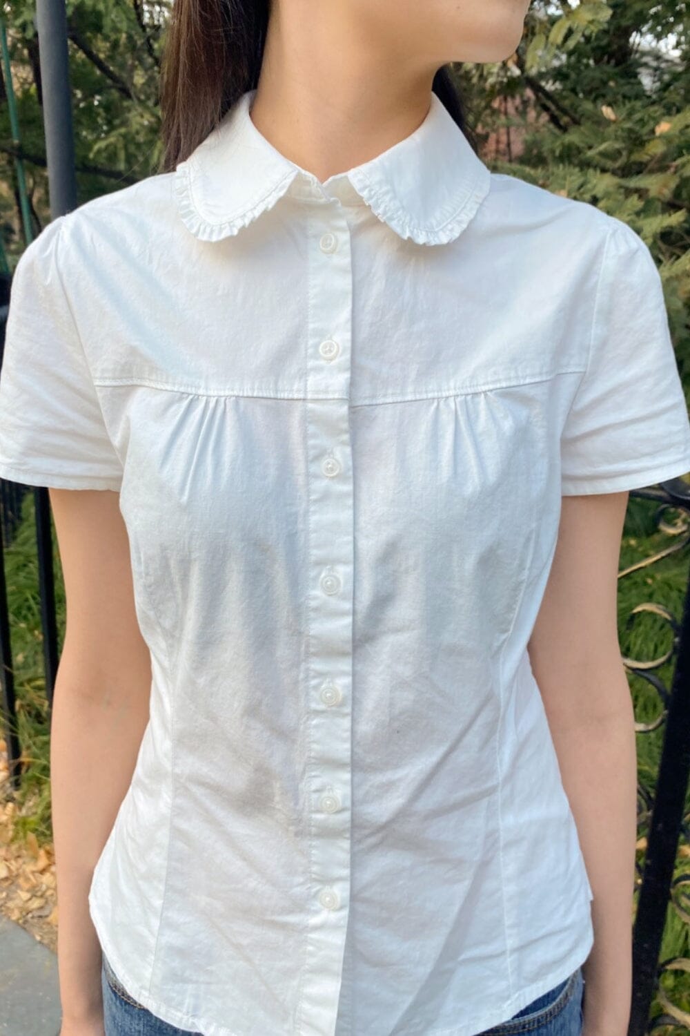 Comfortable and soft collared short-sleeve shirt with buttons and lace on the collar.Fabrics: 100% cottonMeasurements: 23" (58 cm) length, 19" (48cm) bustMade in: China