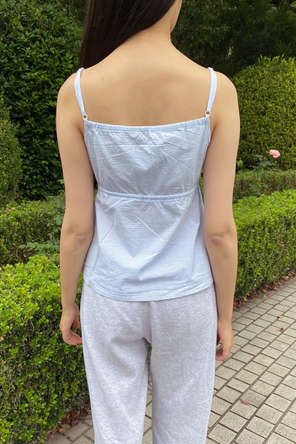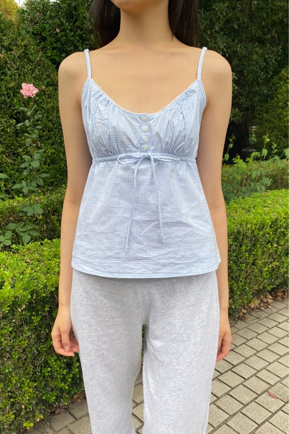 Blouse spaghetti strap plaid tank with ruffle detailing and a seam under the bust, button down detailing, and adjustable straps.Fabrics: 95% cotton, 5% spadexMeasurements: 21" (53 cm) length, 15" (38 cm) bustMade in: China