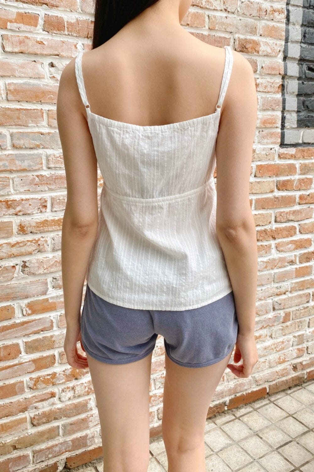Blouse spaghetti strap tank with ruffle detailing and a seam under the bust, button down detailing, and adjustable straps.Fabrics: 100% cottonMeasurements: 14" (36 cm) length, 14" (36 cm) bustMade in: China
